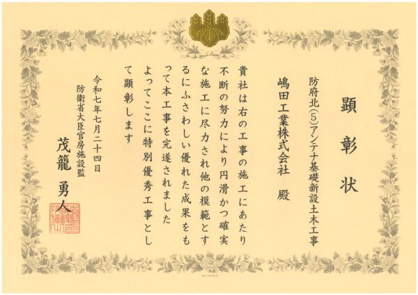 防衛省大臣官房施設監より特別優秀工事として顕彰されました。